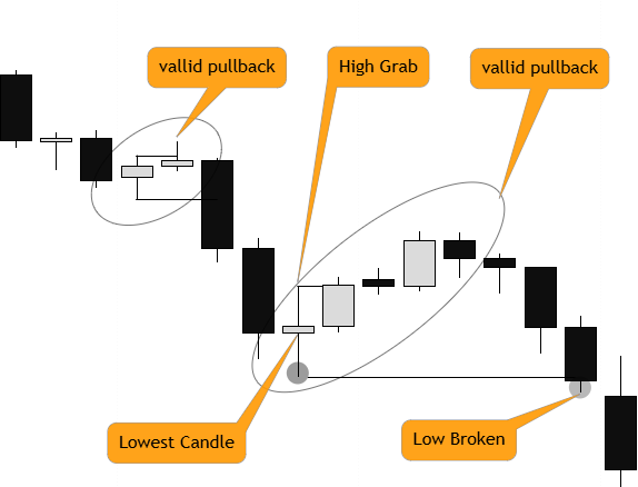Rule Number 2: इसके बाद आपको यह देखना है कि क्या next upcoming Bearish Candle ने उस पिछली Mark की गई Candle के Low को Break या Grab किया है। अगर Low Break नहीं होता है, तो उसे Valid Pullback नहीं माना जाएगा।